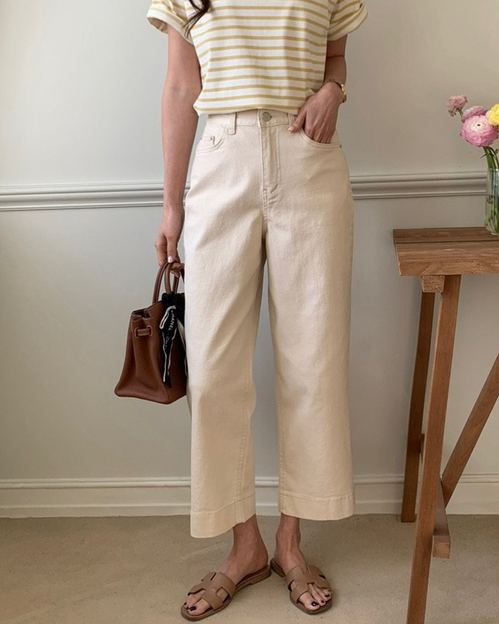 럭키룸 말랑 밑단 트임 크림팬츠 면스판 일자핏 여름 데일리 캐주얼 바지(86636)
