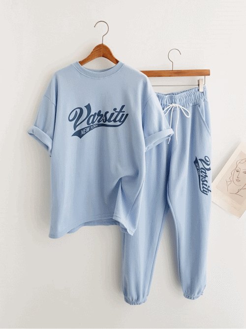 [반팔+조거SET] Varsity 레터링 프린트 루즈핏티셔츠 반팔티셔츠+조거팬츠 조거바지 트레이닝복 추리닝세트 여름트레이닝 데일리세트 체육복 운동복 이지웨어세트