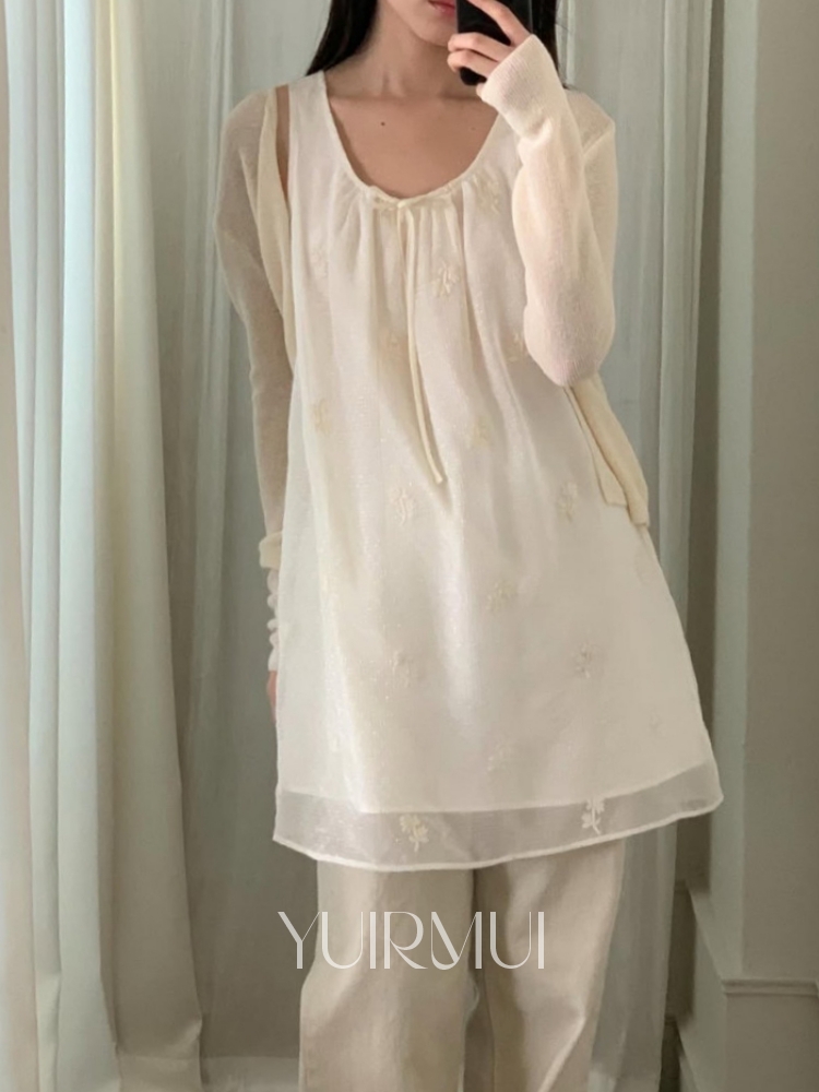 JINSIM 진심 벨라 리본 셔링 플라워 자수 시스루 민소매 슬리브리스 미니 원피스 1color