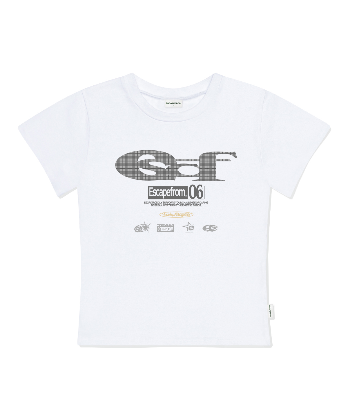 그레이 체크 ESCF 로고 콜라주 프린트 슬림핏 반팔티 화이트