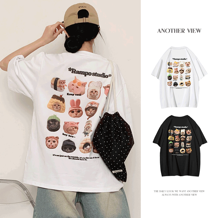 [남녀공용] 캣츠 반팔 티셔츠 순면 고양이 빅사이즈 오버 루즈 반소매 박스티 커플티 유니섹스 레터링 백 프린팅 no.2581