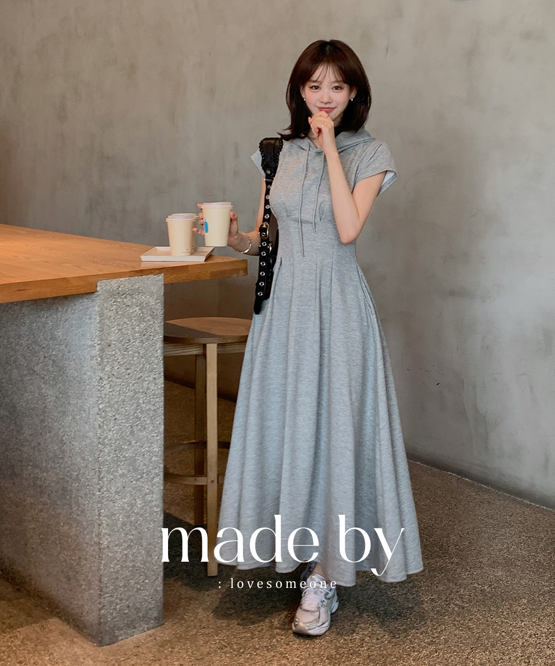 [MADE] 꾸안꾸 후드 핀턱 플레어 캡소매 반팔 트레이닝 롱 원피스