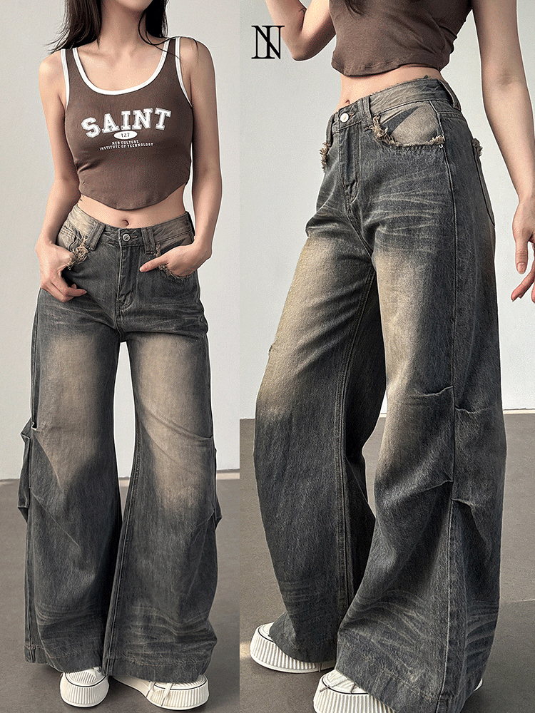 당일출고🚀[made/숏.롱ver] 하이웨스트 캣브러쉬 샌드 워싱 구제 헤짐 핀턱 루즈핏 데님팬츠 2color