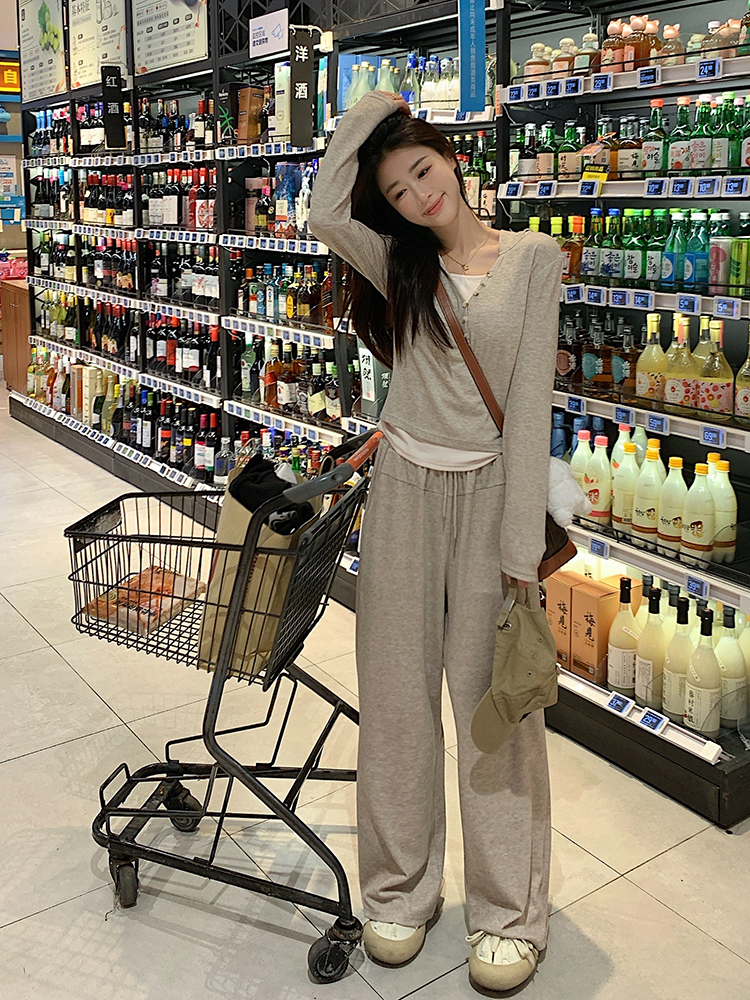 (코디세트)캐주얼 언밸 후드티셔츠+와이드 밴딩 팬츠 트레이닝 투피스 세트 핑크라벨QPF355