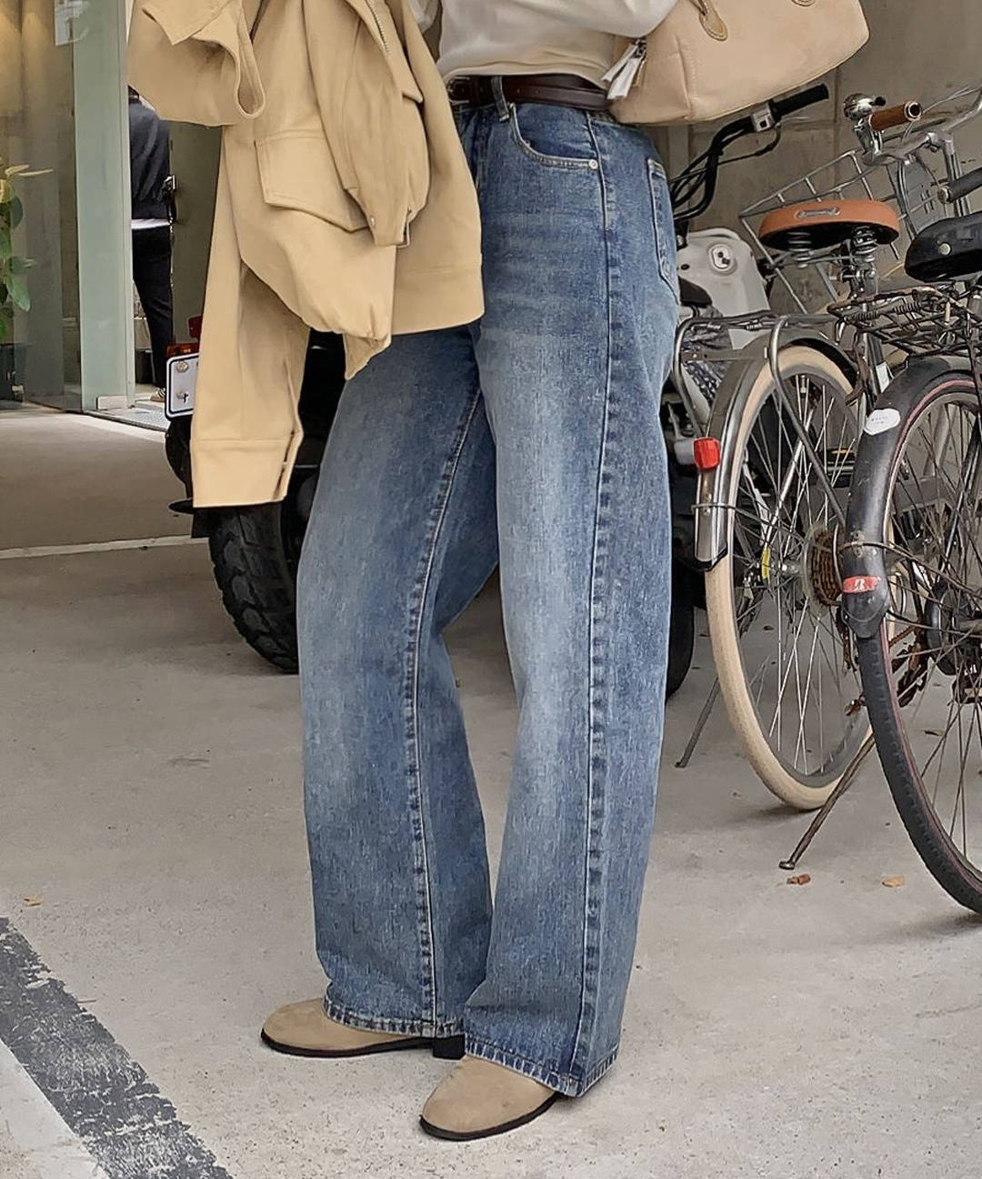 [스타일굿😍][매일입게될][MADE] 커티드 속밴딩 워싱 와이드핏 데님팬츠 (25~36) (빅사이즈청바지-허리밴딩-체형커버-군살커버-세미와이드-빈티지워싱-히든밴딩-사계절템)