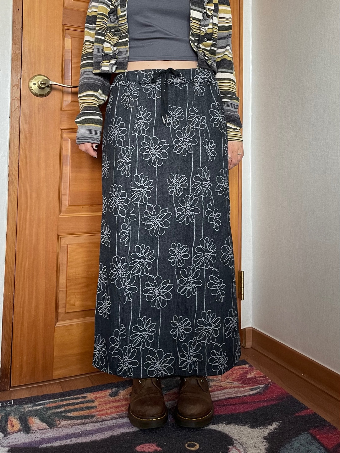 키탐 데님플라워롱스커트 플라워패턴롱스커트 청치마 청롱스커트