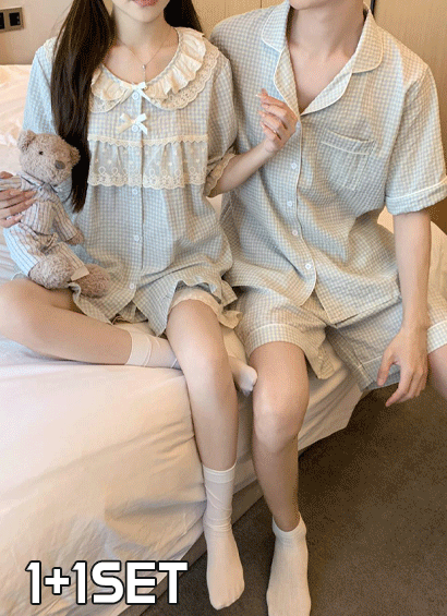 [세트상품] 블리 깅엄체크 여름반팔 커플파자마세트 (반팔반바지 투피스 남성 여성 홈웨어 잠옷)