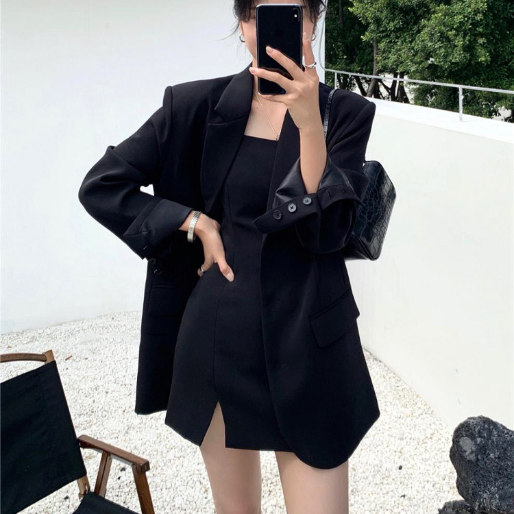 (당일출고/자켓+원피스set) 라운드넥 밑트임 끈나시 슬림핏 하객룩 미니 원피스 루즈핏 오버핏 블레이저 간절기 아우터 자켓 투피스 셋업 세트 4color