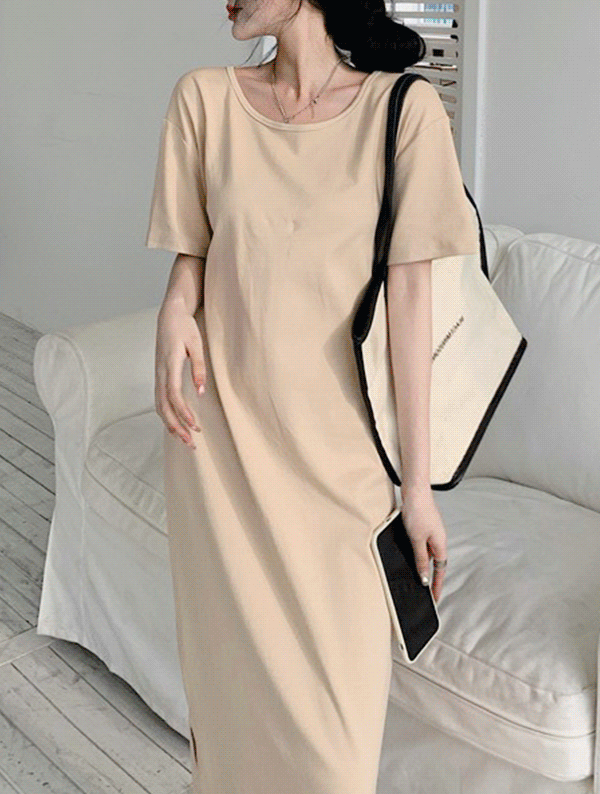 [시원폴리❄] 토핑 옆트임 루즈핏 반팔 원피스 OPS0122봄 여름 레이어드 오버핏 롱 미디 기본 베이직 무지 여행 휴가룩 잠옷룩 휴양지룩 동남아룩 수영복