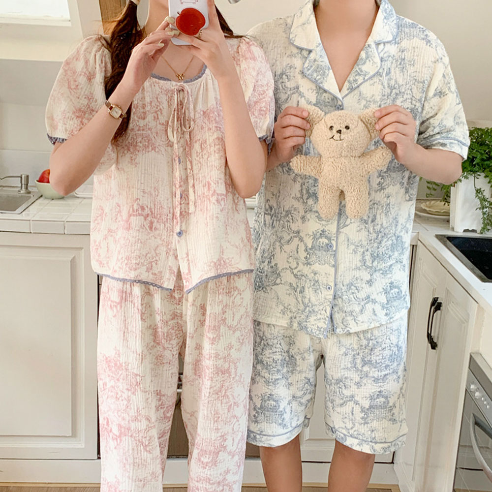 오로라 커플 잠옷 반팔 긴바지 여름잠옷 여자 남자 요루면 순면 파자마 투피스 세트 홈웨어