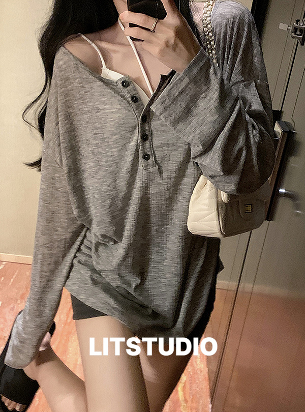 🍂[가을무드/간절기템] 벨 루즈핏 시스루 단추 긴팔 티셔츠 ls1375