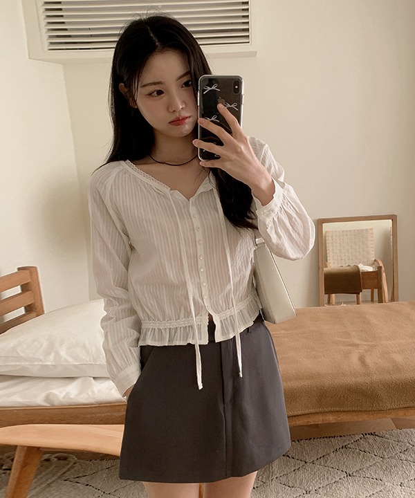 [하객룩][문의폭주][봄]블랑 퓨이 프릴 리본 레이스 긴팔 블라우스 (2color)