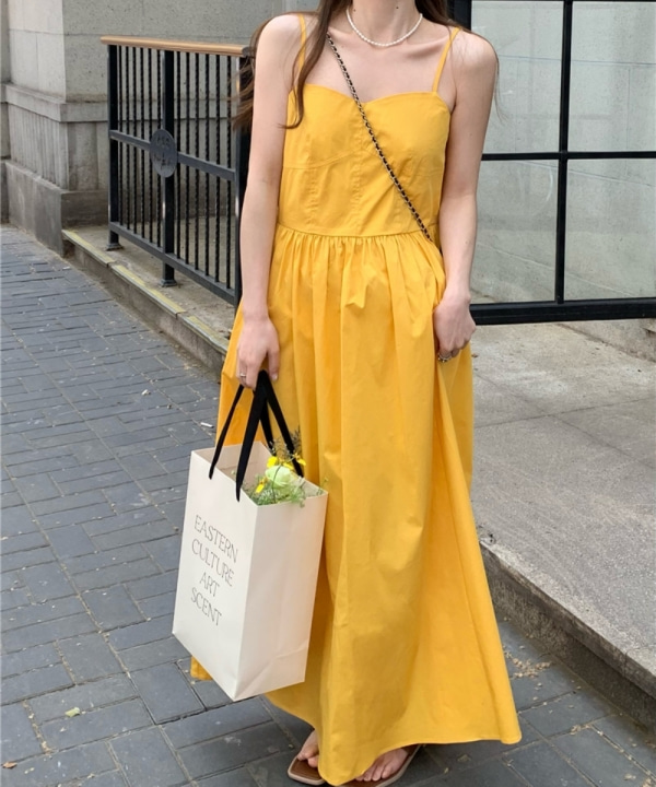 [봄신상💗/색감맛집]개나리 감성 뷔스티에 핀턱 플레어 끈나시 롱 원피스