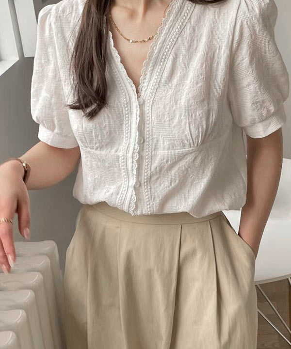 콜리디 레이스 버튼 퍼프 반팔 브이넥 블라우스