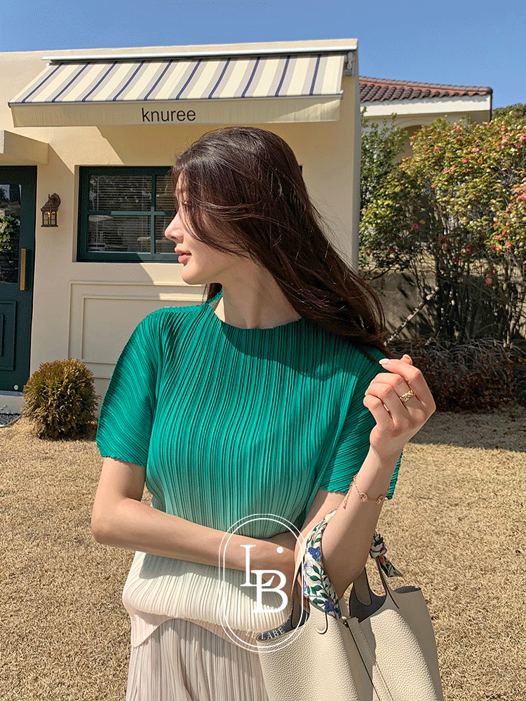 렌토 플리츠 그라데이션 반목 반팔 티셔츠
