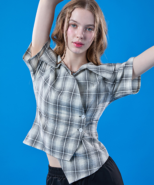 여름 휴양지 랩 오프숄더 체크 쿨링 슬림 반팔셔츠 [IVORY]