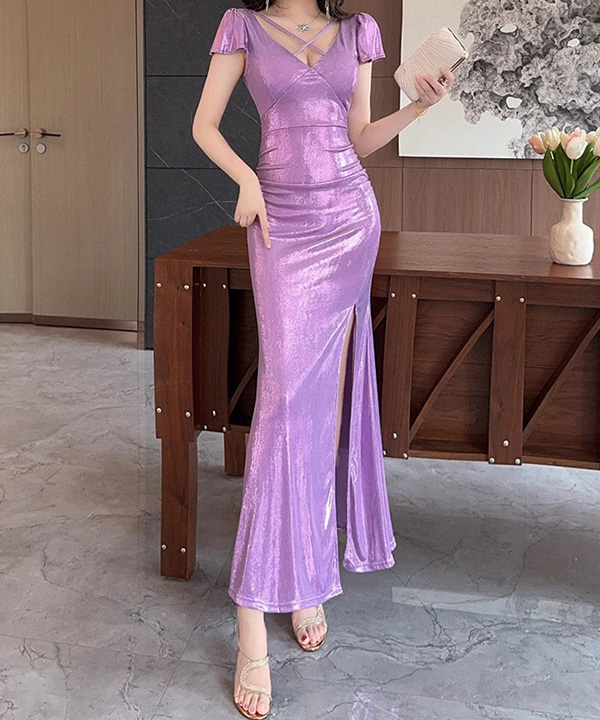 글레인 X자 브이넥 포인트 슬림핏 파티룩 반소매 롱원피스