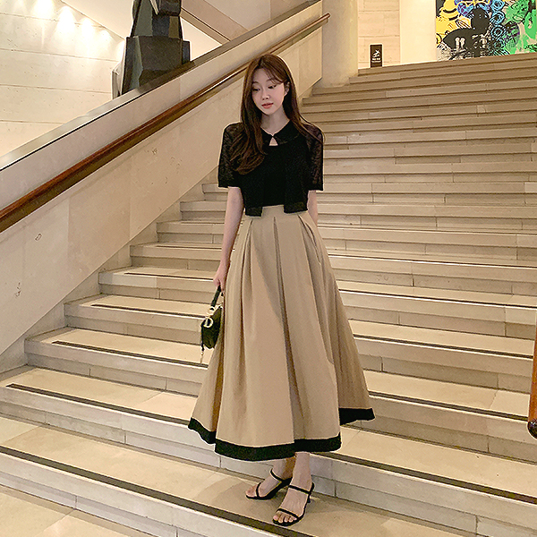 샤플 띠배색 플레어 주름롱스커트*