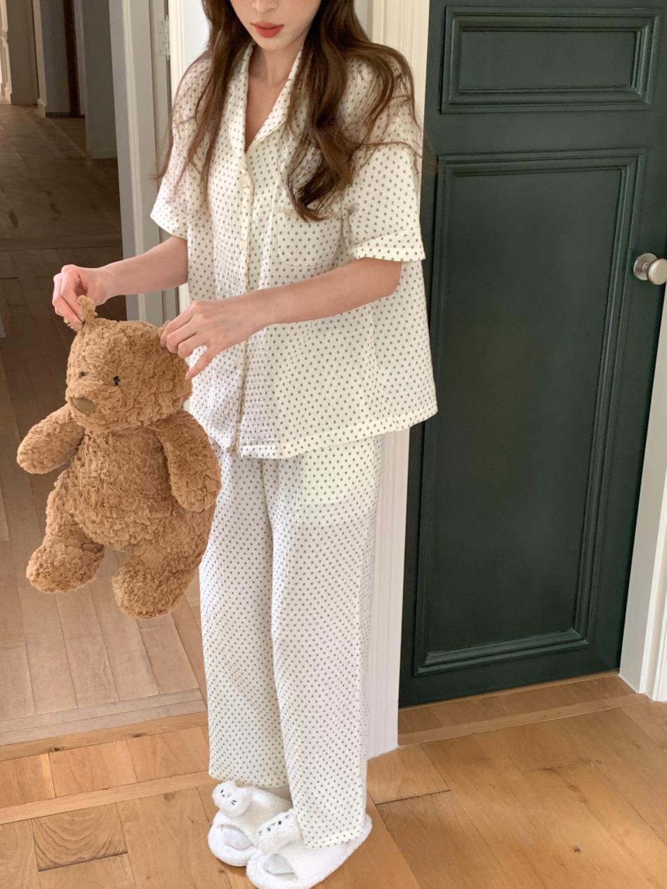 (긴바지잠옷) (썸머플로랄잠옷세트) 여성잠옷 봄 여름 반팔 면 카라 투피스 여자 파자마