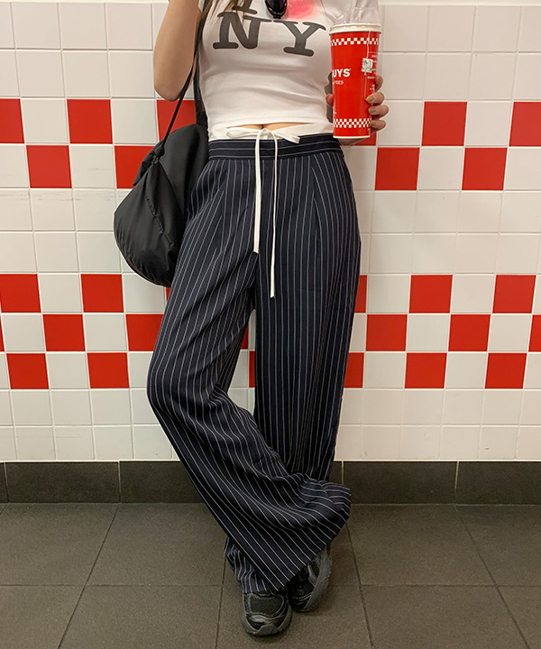 🎬 모니크 배색 스트링 스트라이프 핀턱 와이드 슬랙스 -2color