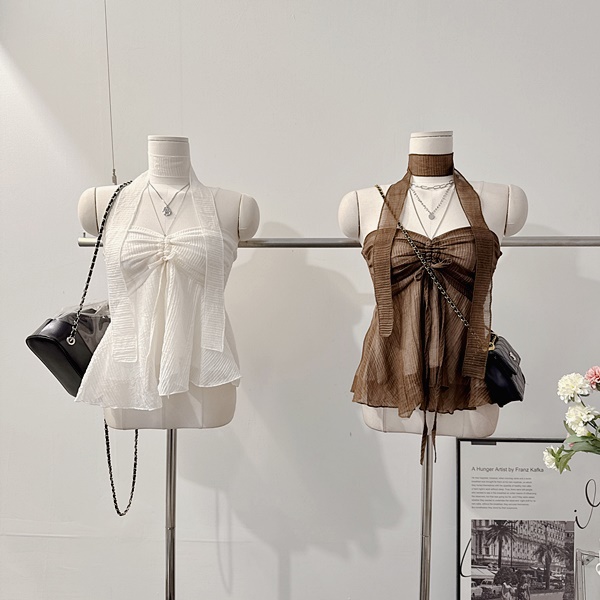 [페미닌!/바캉스룩!] 겨울 하로 머플러 스카프 타이 쉬폰 시스루 리본 스트랩 셔링 프릴 언발 사선 하트넥 오프숄더 튜브탑 레이어드 이너 무지 크롭 나시 블라우스 [4color]