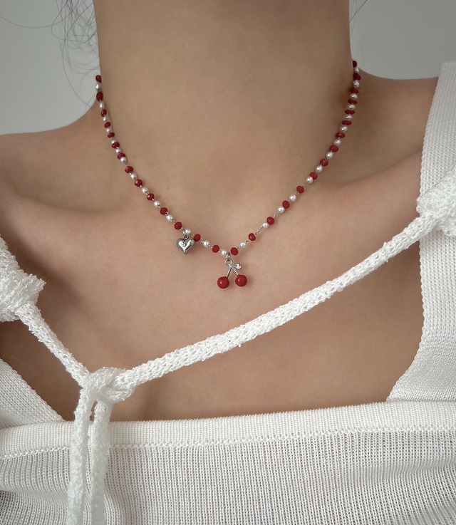 바캉스 룩 chr 체리 비즈 진주 레드 컬러 숏 레이어드 하트 큐빅 목걸이