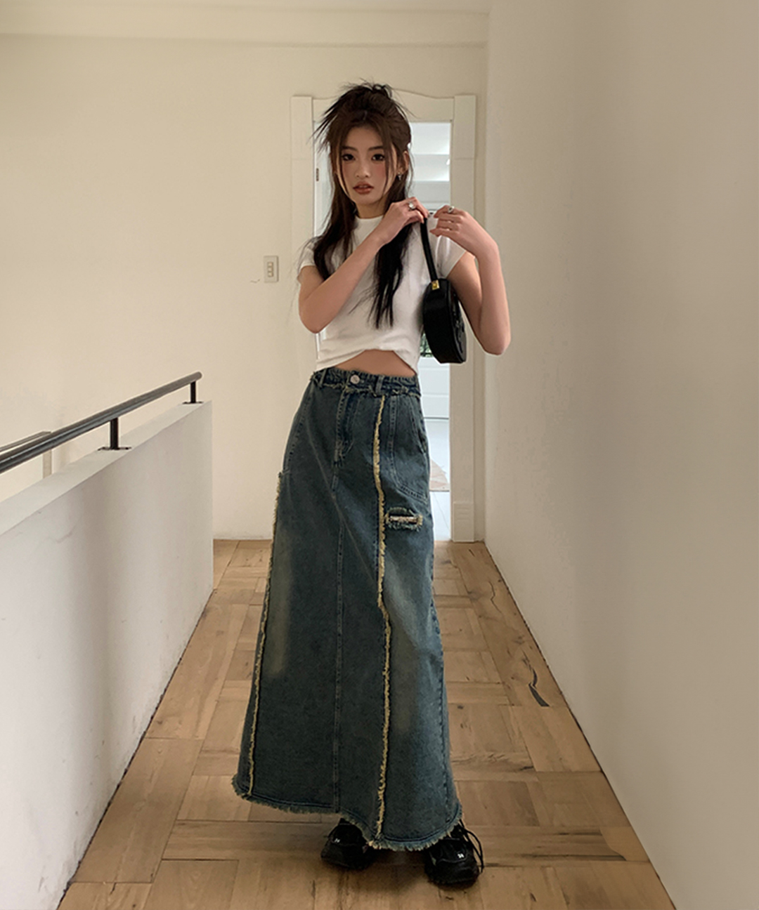 [핏보장][빈티지&레트로] 메이븐 하이웨스트 슬릿 밴딩 데님 롱 스커트