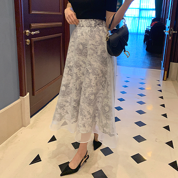 하우스 이중 쉬폰 플레어 나염스커트*