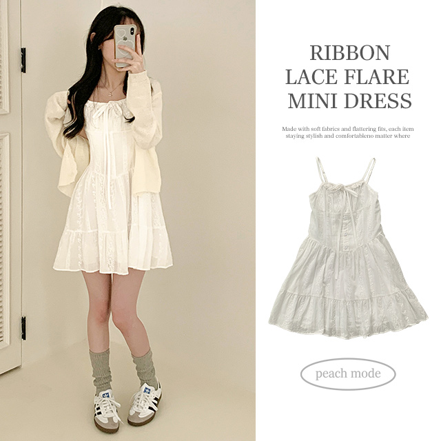 [봄,여름원피스/휴양지룩] 베르소 리본 레이스 플라워 자수 플레어 나시 미니 원피스 (1color)