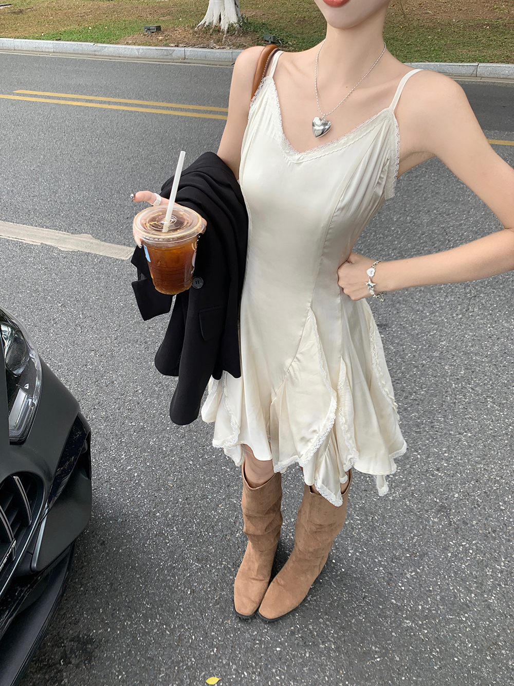 레이스 스티치 브이넥 언밸 플레어 서스페넏 나시 미니원피스 이뽀다EKE578