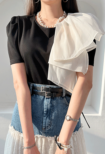 조에 배색 셔링 티셔츠
