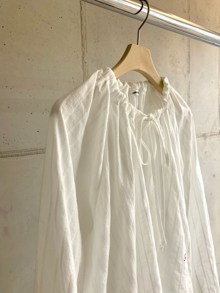 하우스 리베르자수블라우스 haus 25ss 리본 셔링 라운드 스트라이프 자수 로고 bl
