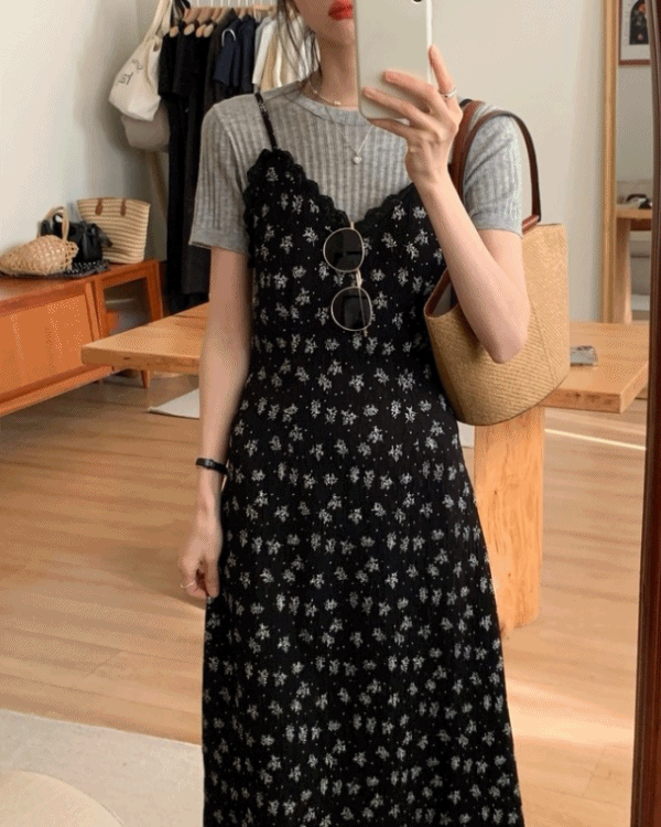 🌷데일리BEST🌷베일린 브이넥 레이스 나염 패턴 뷔스티에 레이어드 나시 롱 원피스