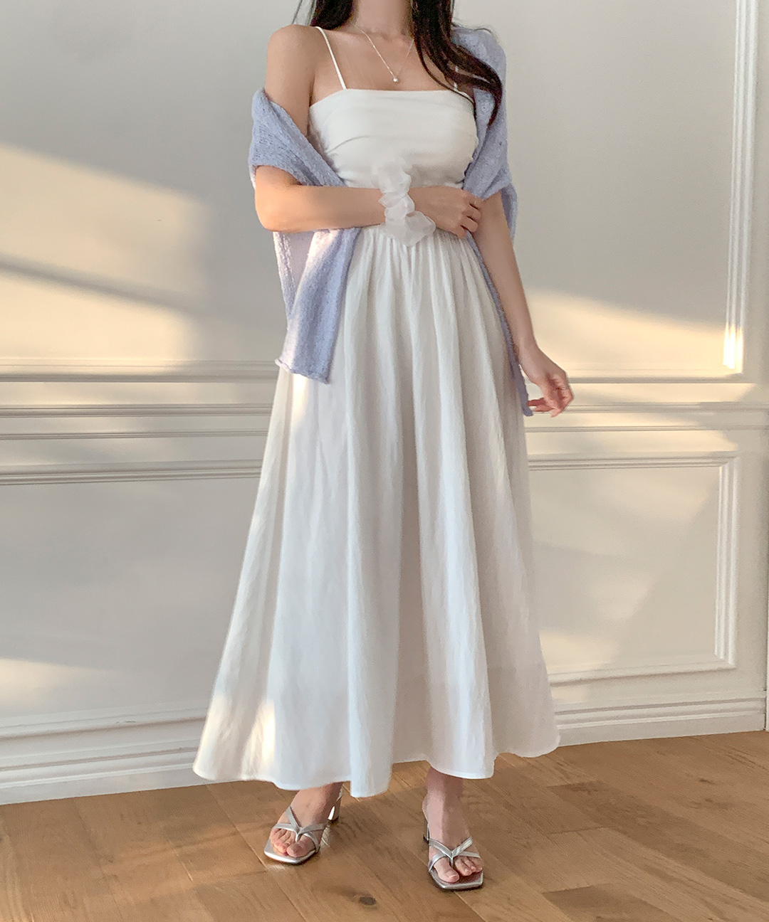 (캡내장) 쥬브 패드 내장 화이트 플레어 캡 나시 롱 원피스