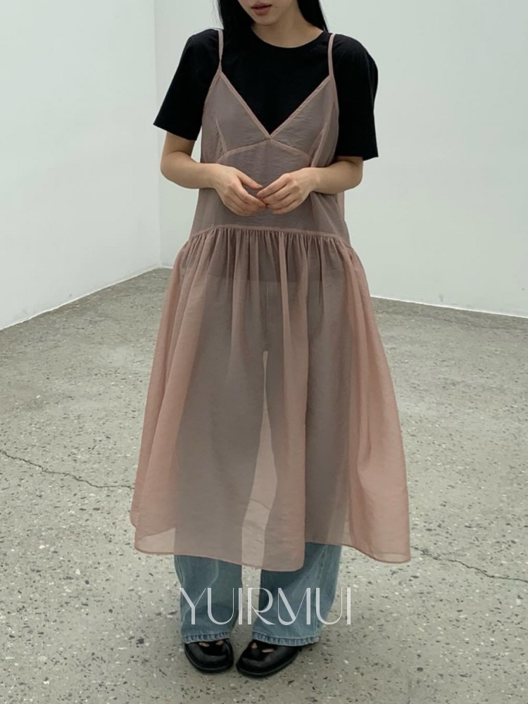 SNTA 러브마이산타 오간자 시스루 레이어드 브이넥 슬리브리스 롱 원피스 4color