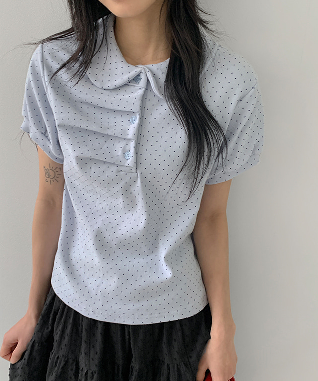 [무료배송] 마로니 도트 셔링 카라 반팔 티셔츠