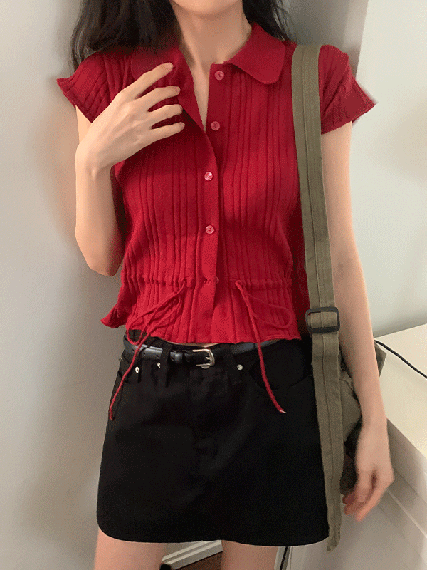[아이당일] 트로키 버튼 카라 셔링 반팔 니트
