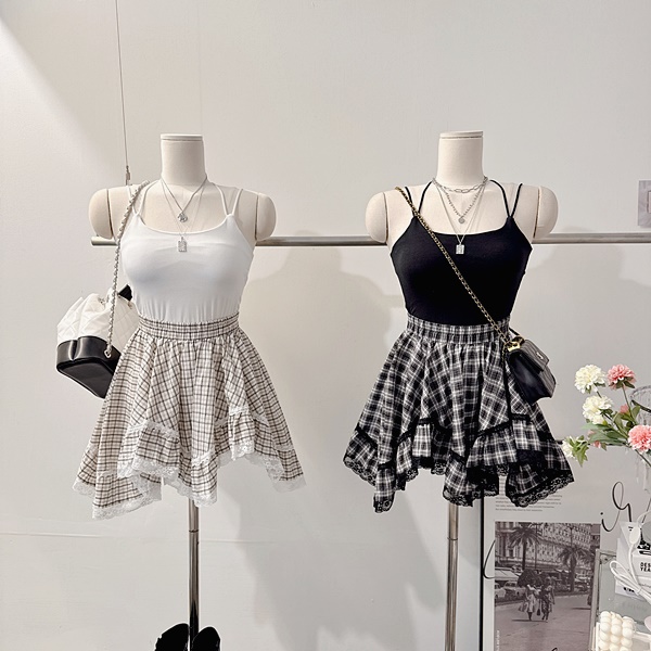 [y2k!/하이틴!/유니크!] 겨울 로엔 면 체크 배색 펀칭 레이스 밴딩 하이웨스트 로우웨스트 언발 사선 A라인 플레어 주름 플리츠 셔링 프릴 캉캉 미니 스커트 [2color]