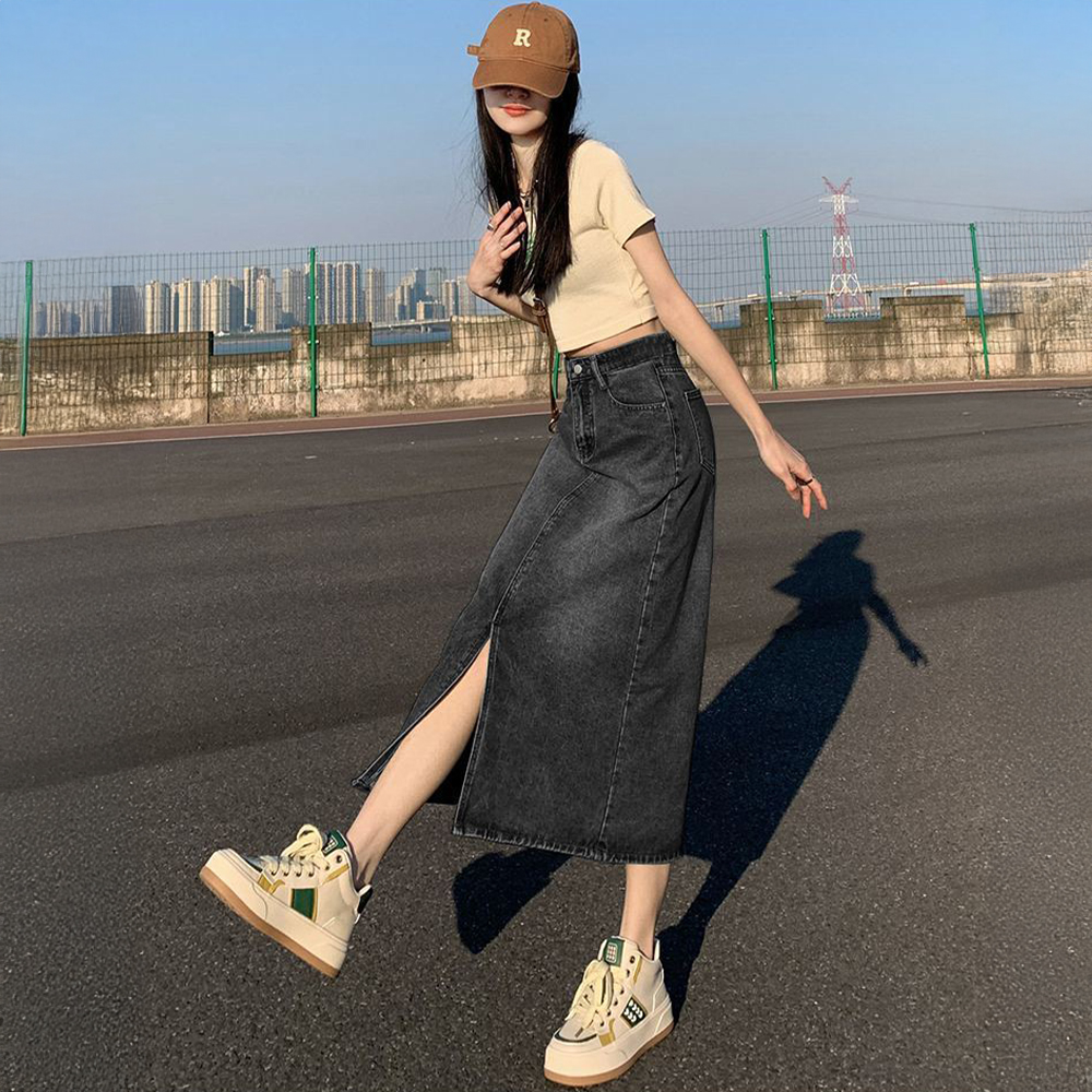 청 치마 앞트임 롱레그 라인 하이웨스트 롱 데님 스커트 블랙 흑청 연청