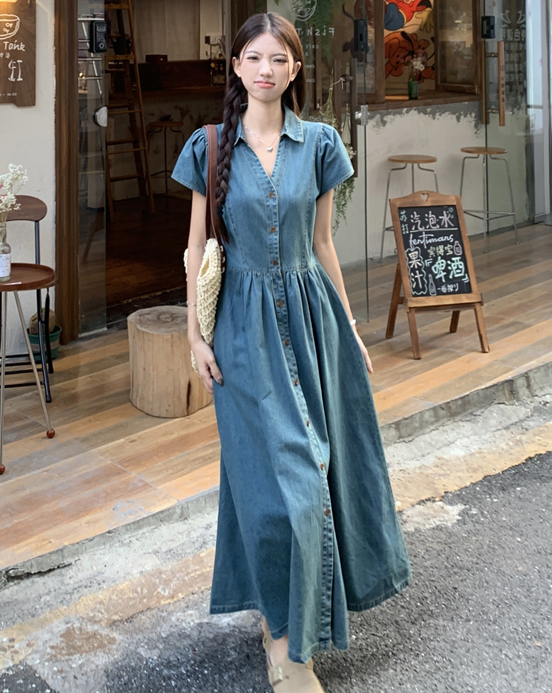 데이트 주말룩 카라 포인트 롱 반팔 롱 데님 셔츠 원피스