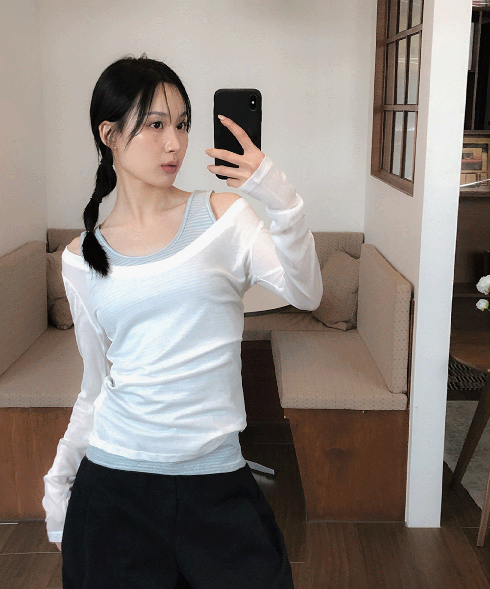 이츠 시스루 유넥 오프숄더 긴팔 티셔츠
