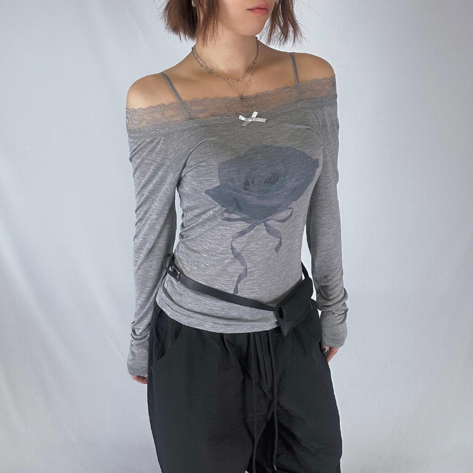 로즈 레이스 오프숄더 슬림 긴팔티 유니크 여자 스트릿 슬림핏 얇은 롱슬리브 티셔츠