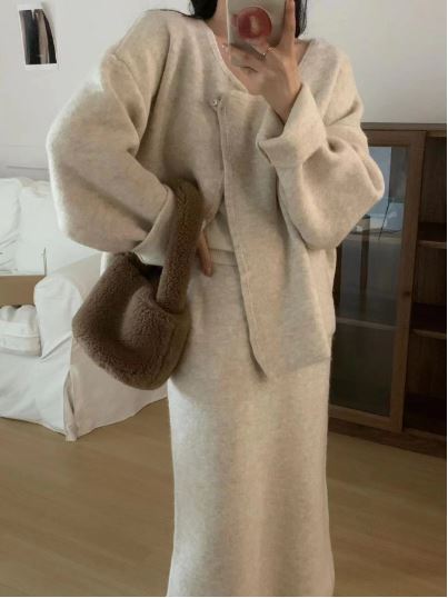 셋업 노카라 원버튼 니트 가디건 & 밴딩 h라인 롱 스커트 (3color)