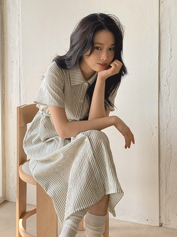 J'eu 메이트 스트라이프 자수 반팔 원피스 파자마 잠옷 2color