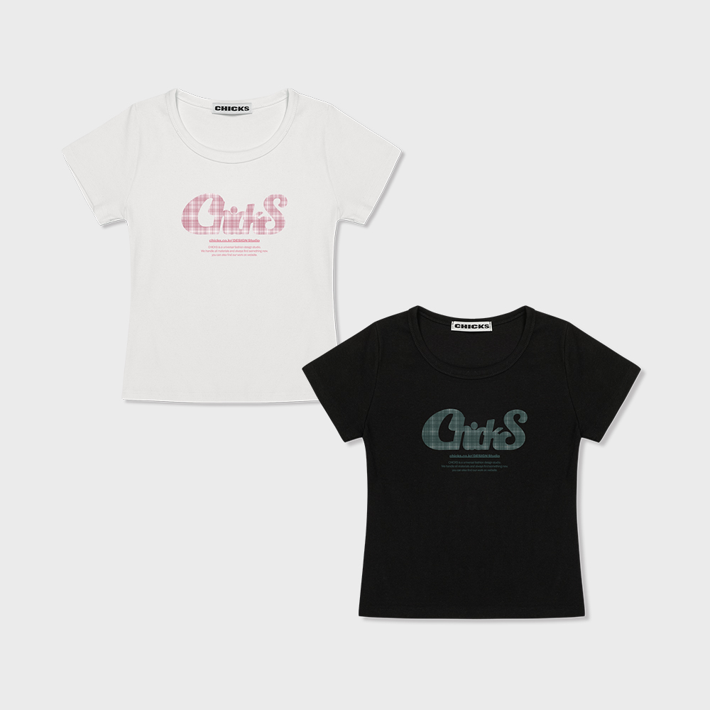 체크 패턴 타이포 크롭 슬림핏 반팔 티셔츠