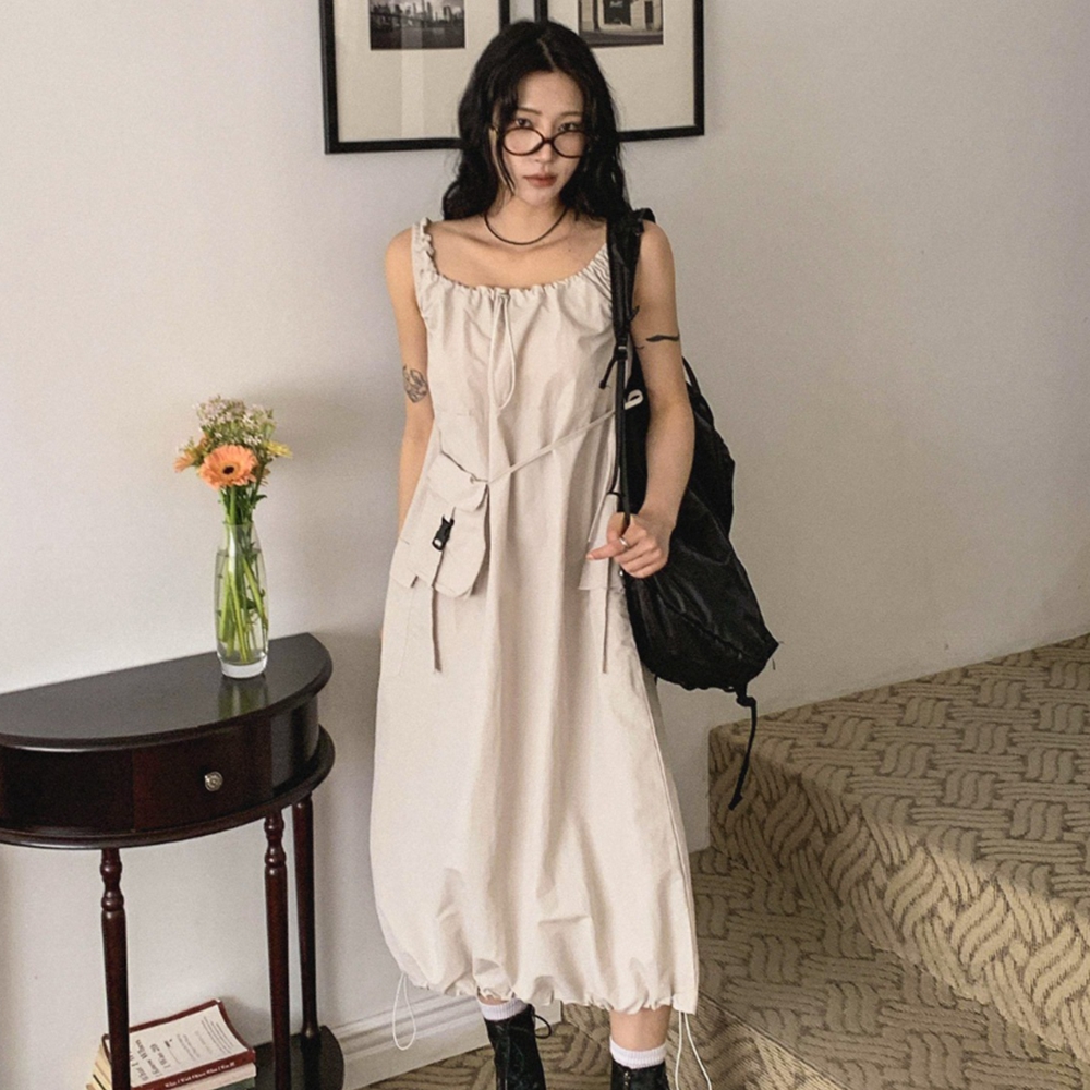 여자 바스락 나일론 포켓 백포함 나시 스트링 원피스