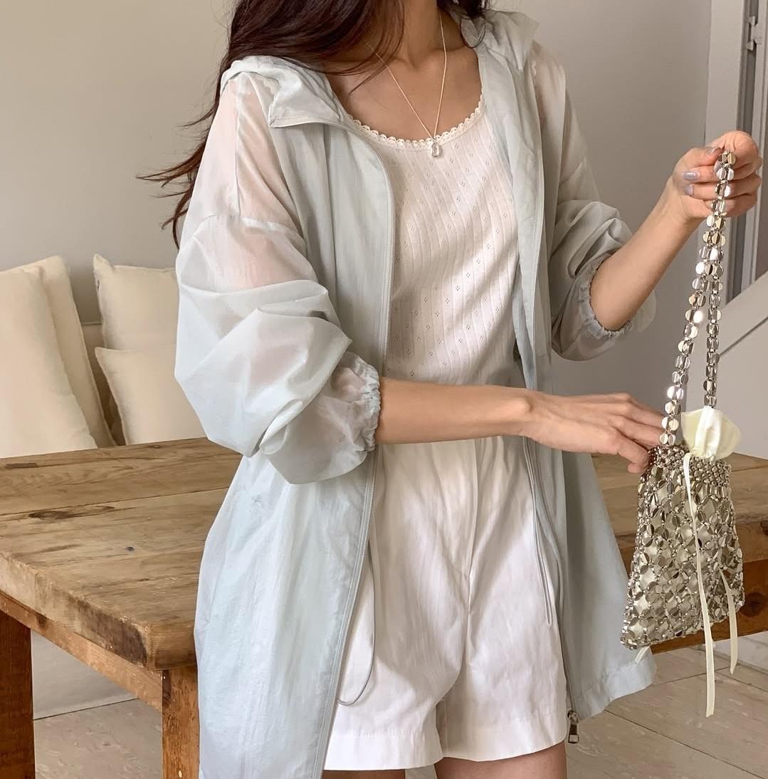 시스루 바스락 여리 스트링 스토퍼 바람막이 하이넥 후드 집업 하프 레인 점퍼
