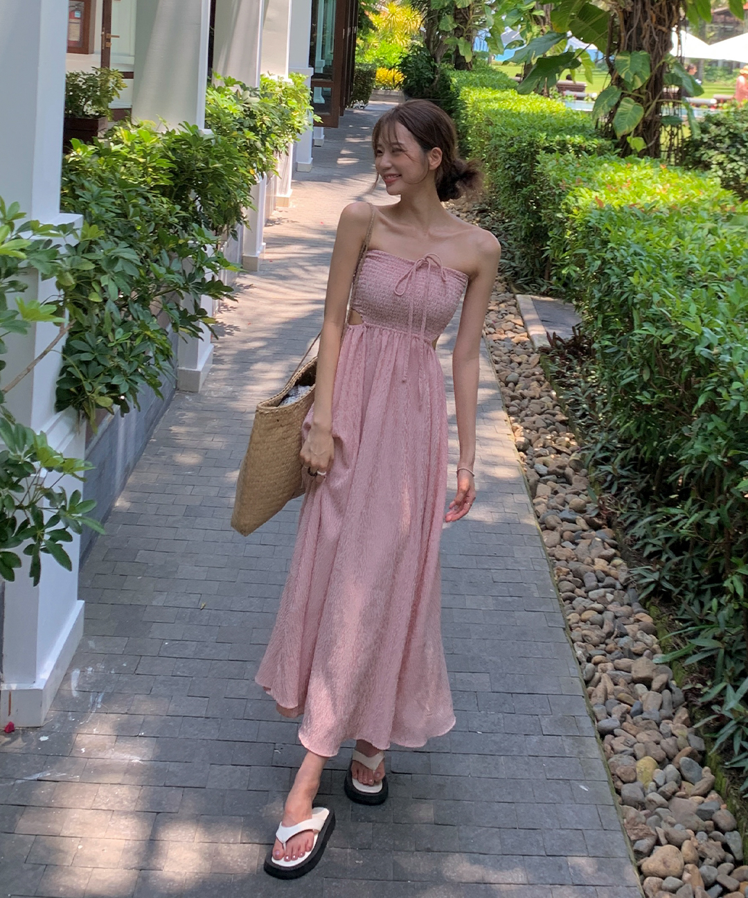 홀릭 홀터 비치 스모크 밴딩 오프숄더 맥시 롱 원피스