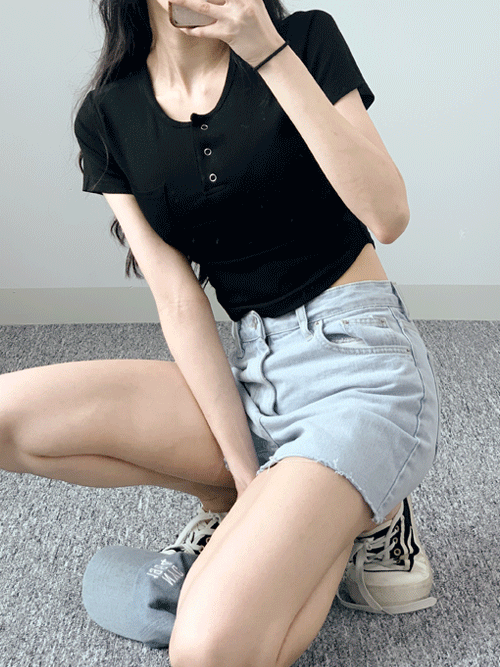 [5color] 굴림 헨리넥 단추 포켓 셔링 골지 반팔 티셔츠 BTD232