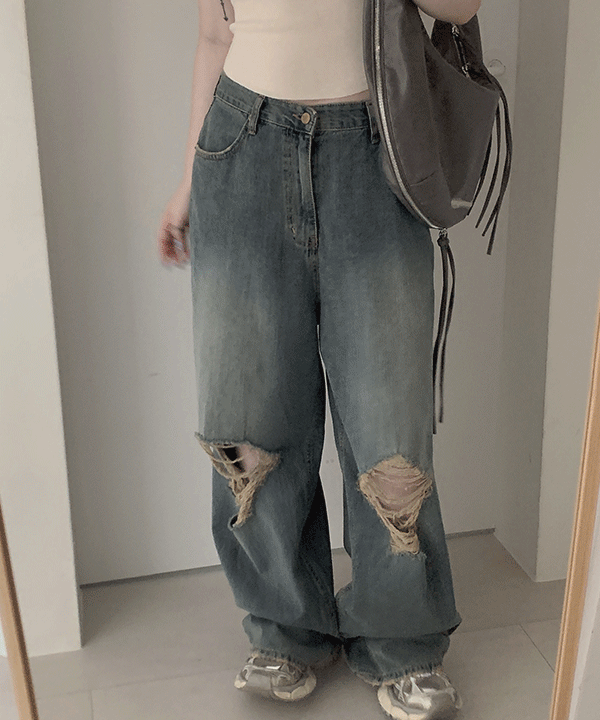 #13305 유니크 컷팅 데미지 찢청 워싱 와이드 맥시 롱청바지 : 데님 1color / S~L